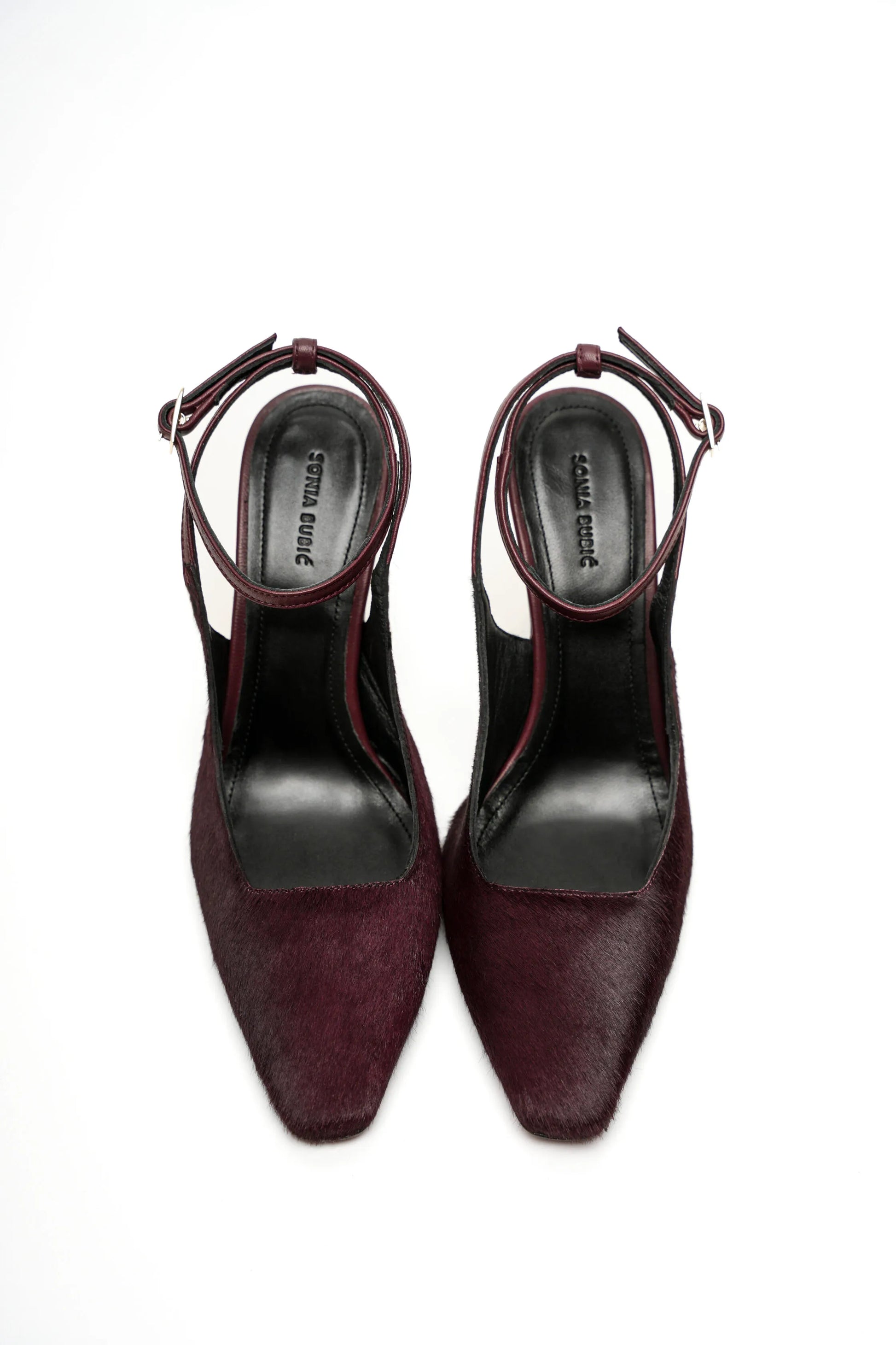 Burgundy pony hair slingback pumps with a round square toe and stiletto heel, buckled ankle strap closure.