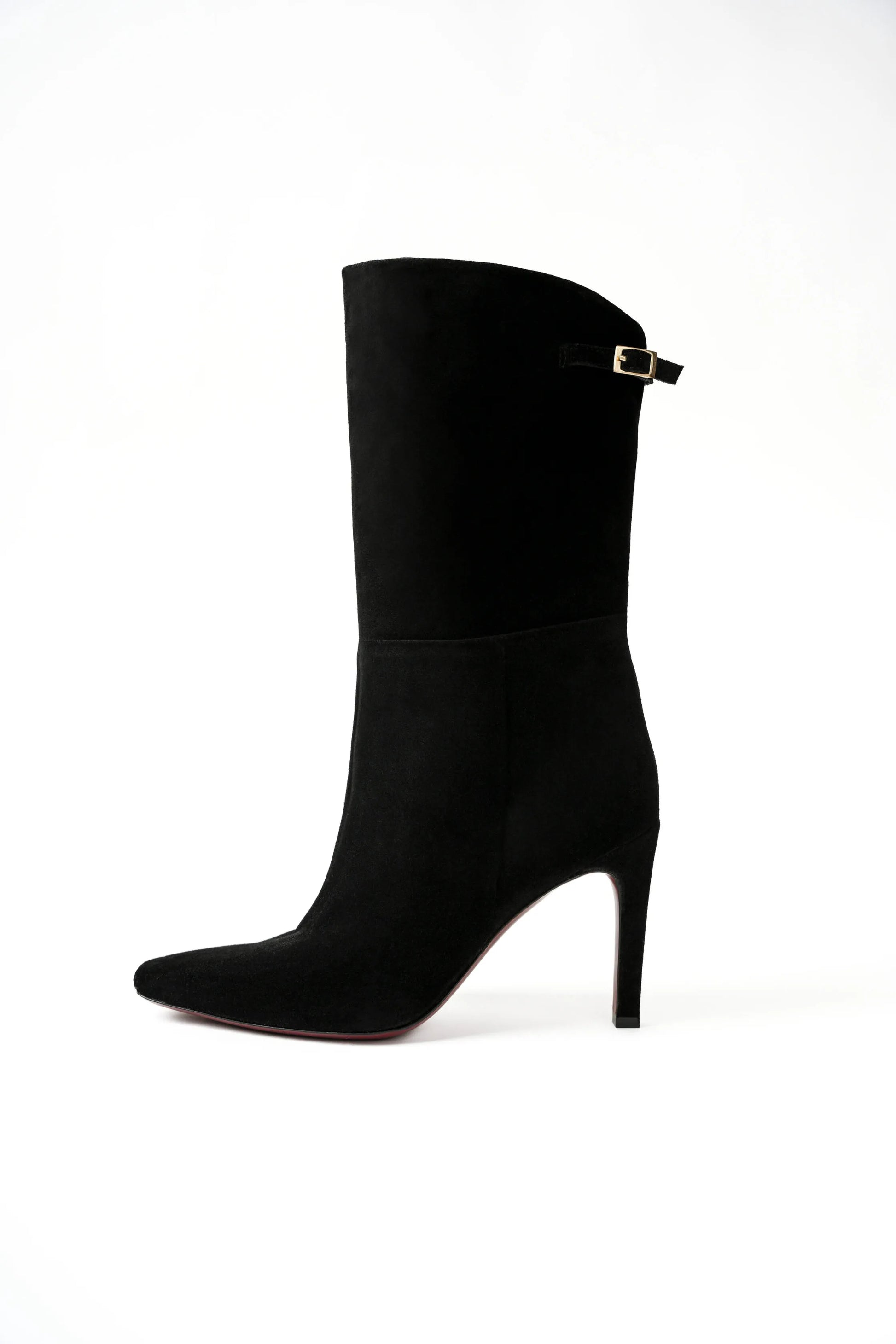 Black suede leather tube boots below the knee, with a stiletto heel and round square toe, decorated with buckle strap at the top of the boot.