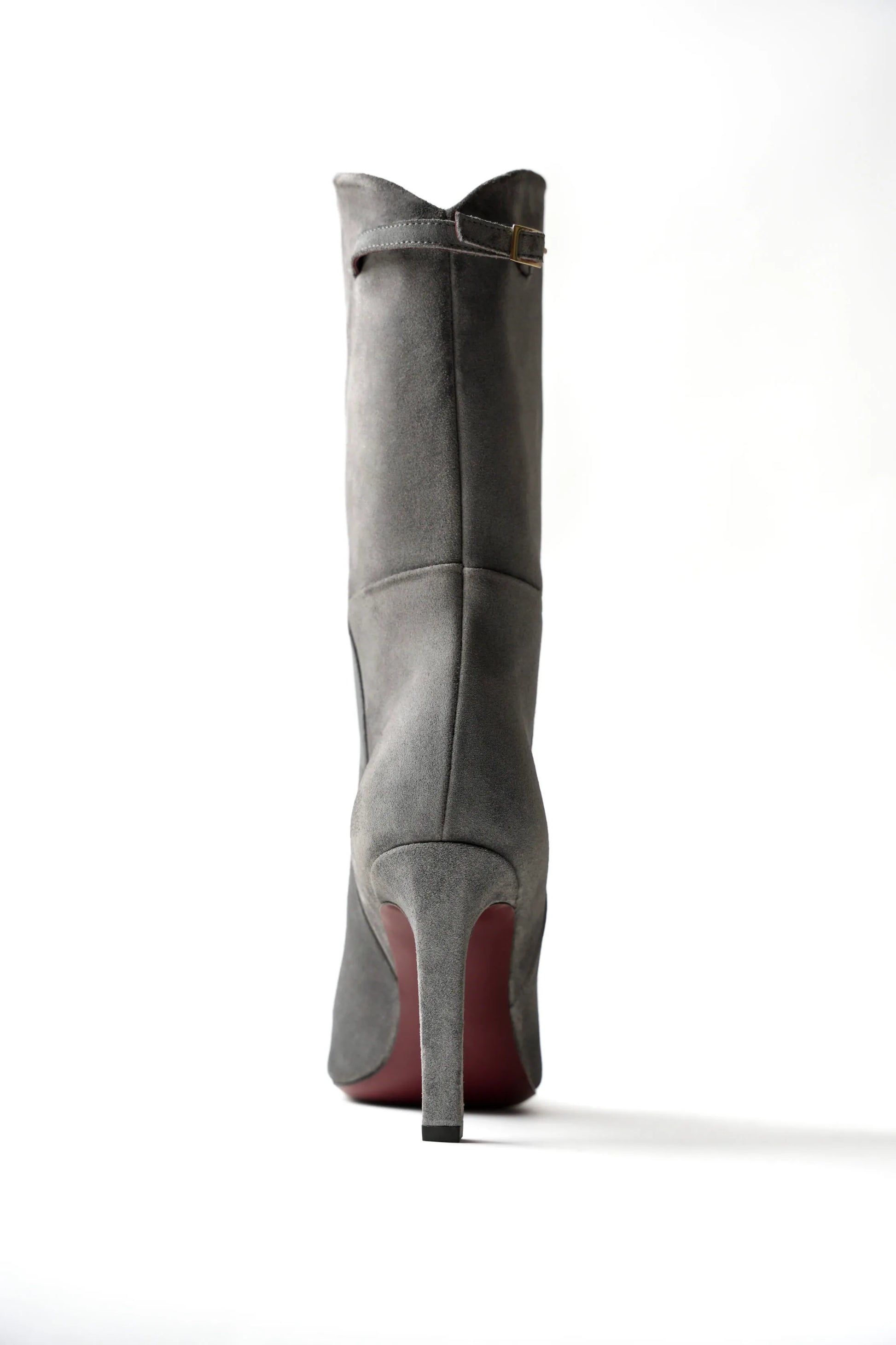Grey suede leather tube boots below the knee, with a stiletto heel and round square toe, decorated with buckle strap at the top of the boot.