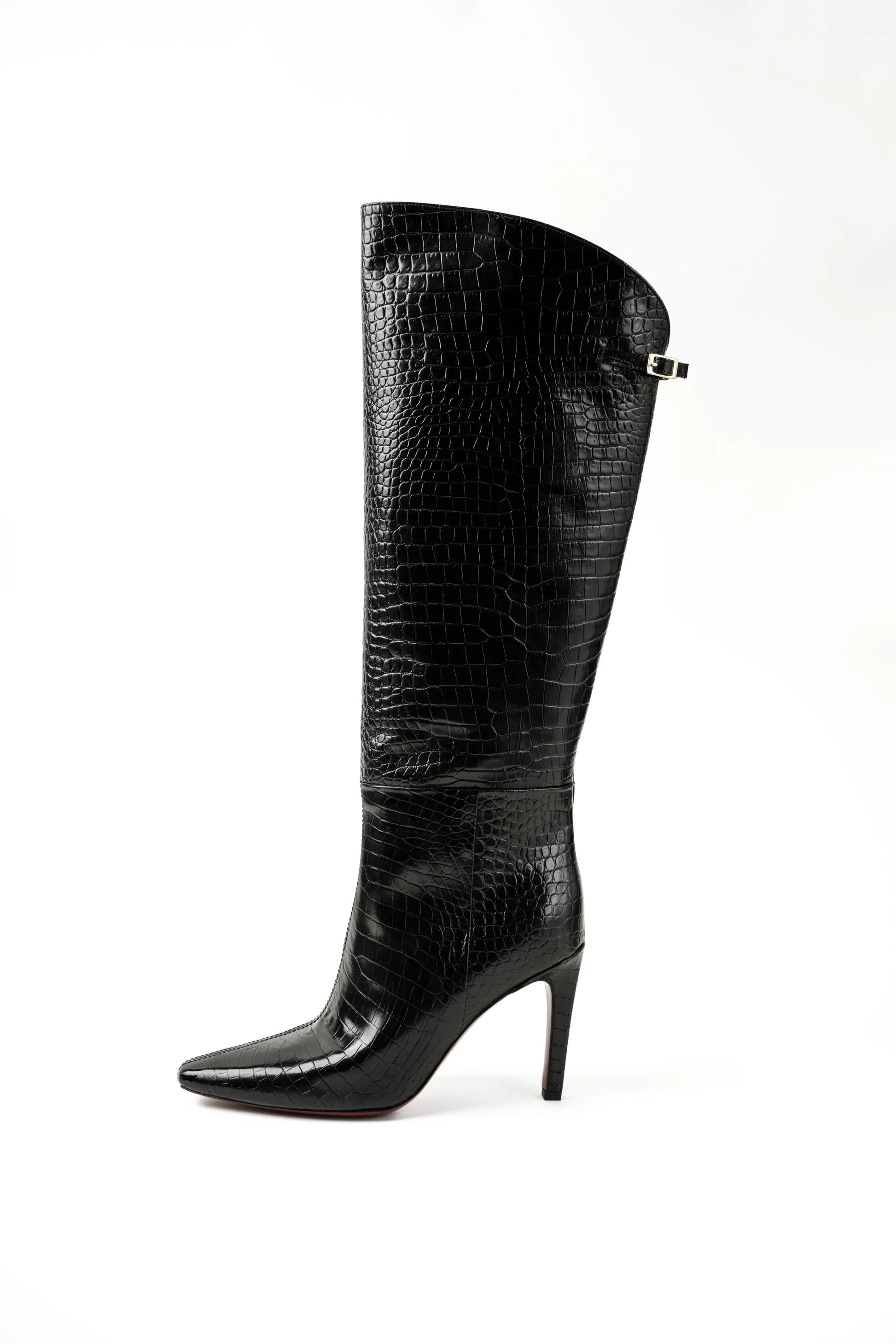 Croco-print leather tube boots below the knee, with a stiletto heel and round square toe, decorated with buckle strap at the top of the boot.