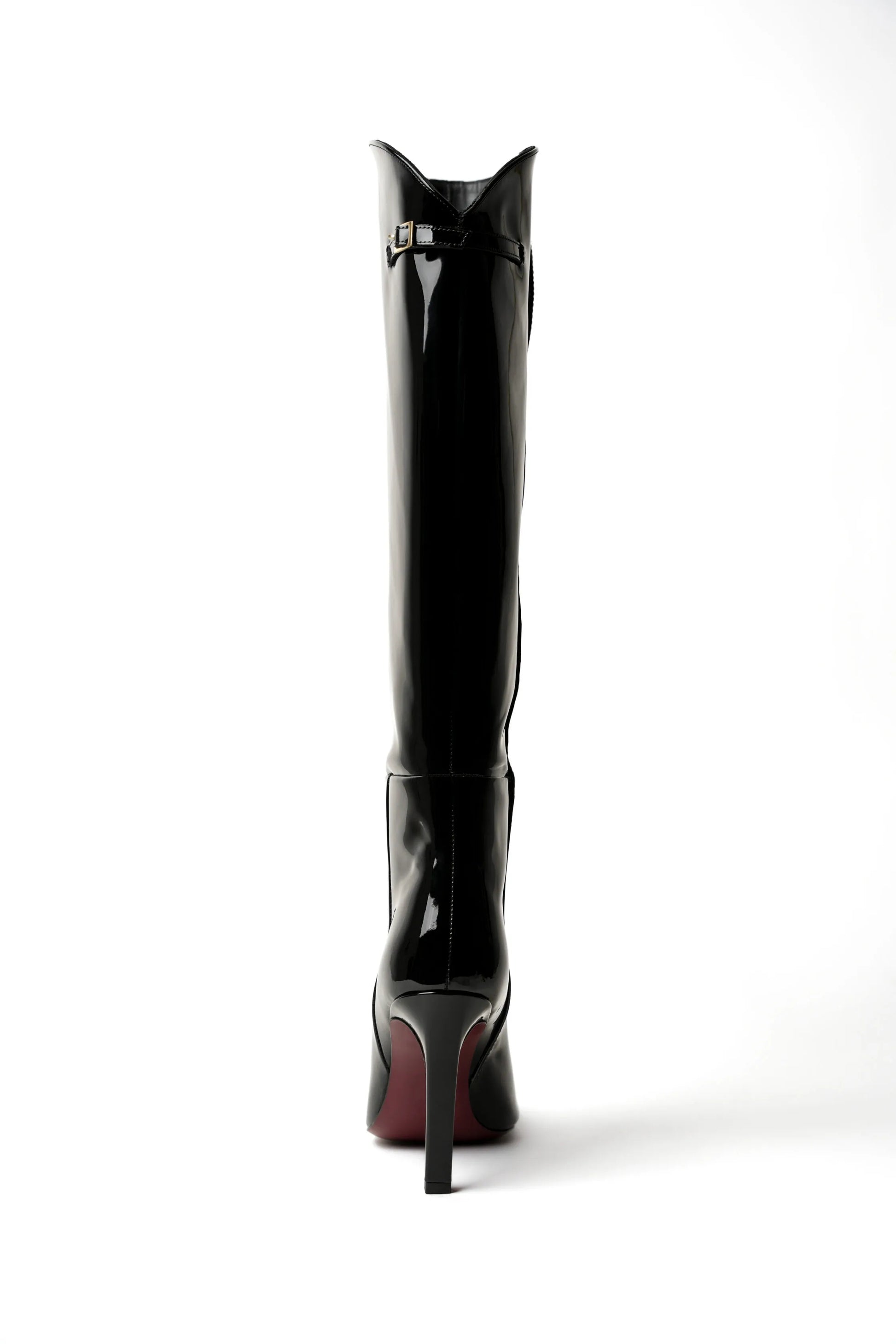 Patent black leather tube boots below the knee, with a stiletto heel and round square toe, decorated with buckle strap at the top of the boot.